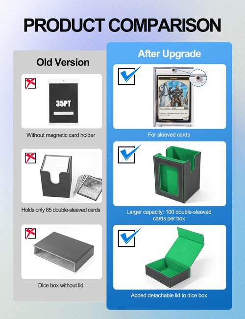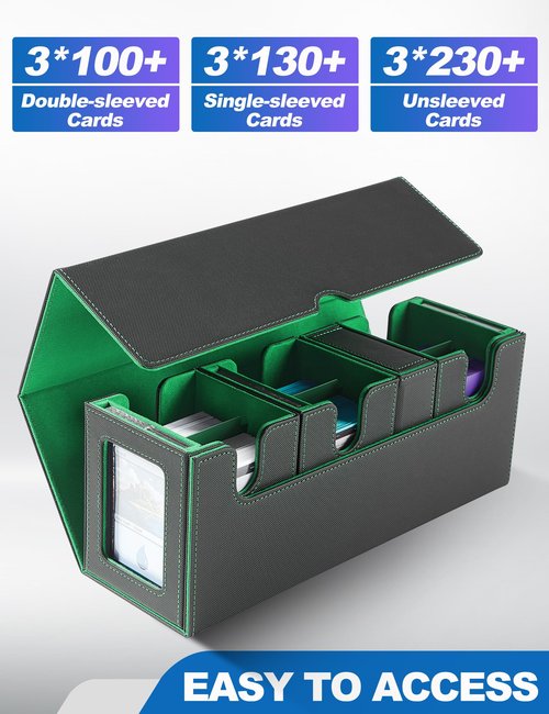 - 4-in-1 Card Deck Box: This commander deck box contains three deck boxes that hold 3*100 double-sleeved cards, 3*130 single-sleeved cards, 3*230 unsleeved cards. The dice box can be used to store dice, game coins and counters. If you like collecting cards and need a box that can store cards, this would be a good box to have