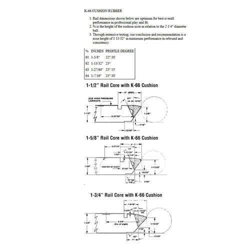 Details: Championship K66 Cushion Rail Rubber 48" Set of 6 Championship K66 Cushion Rail Rubber 48" Set of 6. Will fit up to 9 foot table. As a long time leading supplier of Cushion Rubber to the Billiard Industry, Championship has had an ongoing research and development program to produce the best quality and most consistent playing billiard cushions made today. After consulting with professional players and leading polymer chemists, Championship has developed a line of billiard cushions that set new industry standards. To insure that Championship’s strict testing criteria and tolerances are met, we developed our own American Made tooling. Championship’s tooling, “state of the art” manufacturing facility and strict quality control measures assure maximum integrity of formula and proper cure of each and every production run. The result is a line of Billiard Cushions with exacting tolerances required in durometer, dimensional accuracy, rebound, specific gravity elongation and overall performance. Both of Championship’s billiard cushions, and Mercury came within BCA standards for accuracy 100% of the time at all three speeds. None of our competitor’s billiard cushions that we tested came close to demonstrating the accuracy Championship’s billiard cushions achieved. You can’t beat 100% accuracy.