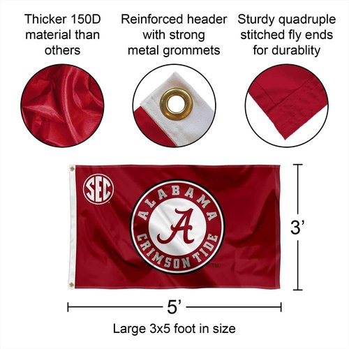 Details: University of Alabama SEC Logo Flag and Pole Bracket Mount Bundle includes the 3x5 foot flag as shown and our recommended accessories of a 6 foot spinning flagpole and adjustable flag bracket. The Officially Licensed flag is made of single-ply 150d Polyester, has screen printed logos and insignias (opposite side is reverse image), includes quadruple stitched flyends, and two metal grommets.The included flagpole is our spinning aluminum flagpole so the flag will fly tangle free and all grommet clips and attachments are included. The adjustable aluminum flag bracket adjusts from 0-180 degrees so you can fly this flag and pole at any angle. Our flagpole and bracket bundle is a ideal gift item and includes all hardware for easy setup.