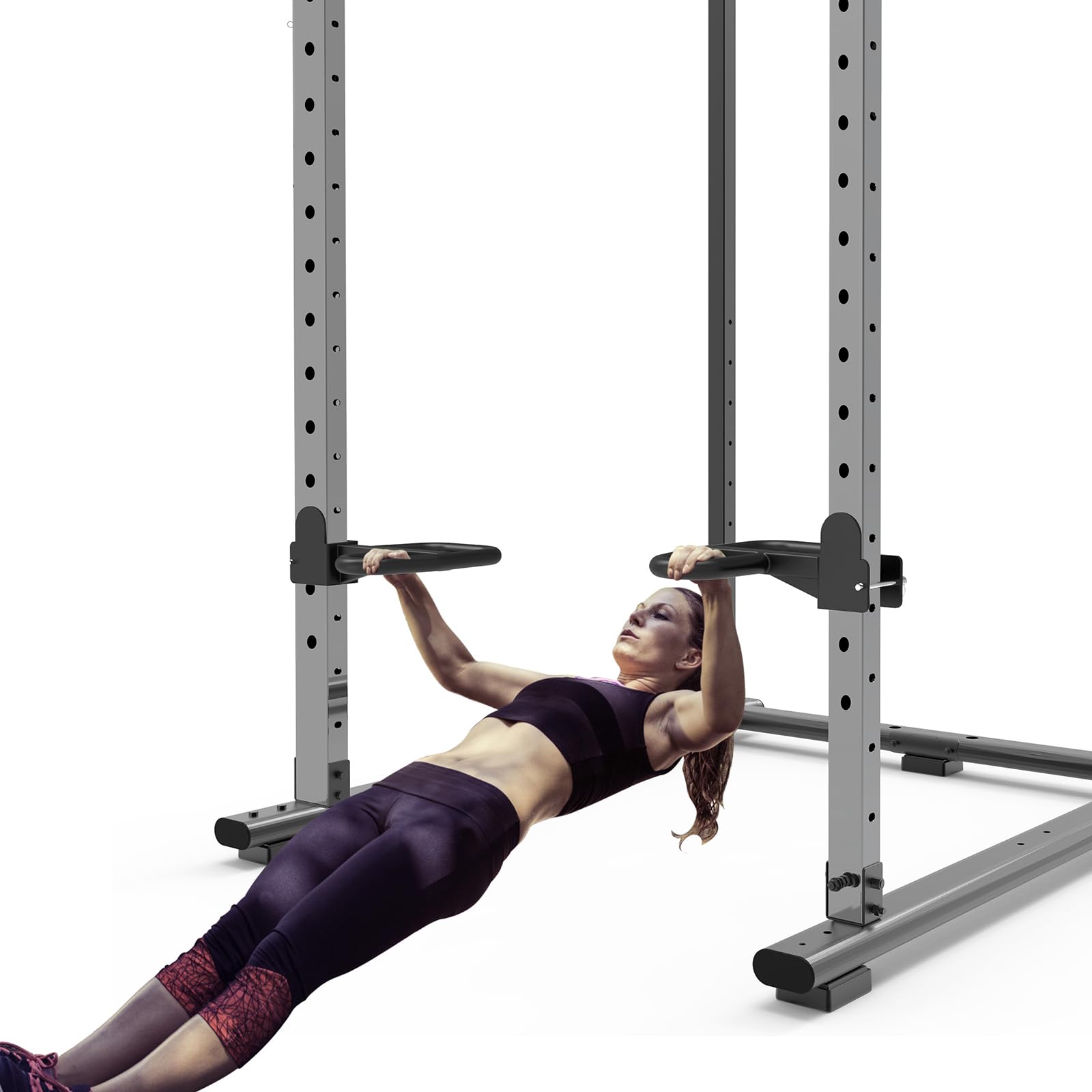 - EASY TO INSTALL AND ADJUST: Simply slide the pin into the power rack’s hole, swing down to lock in place, and secure with the metal safety pin. Adjust the height and position of the dip bars according to your preference and exercise